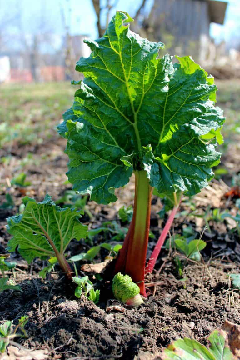 Rabarber groeit als een soort struik met groene of karmijnrode stelen onder grote donkere groene bladeren.