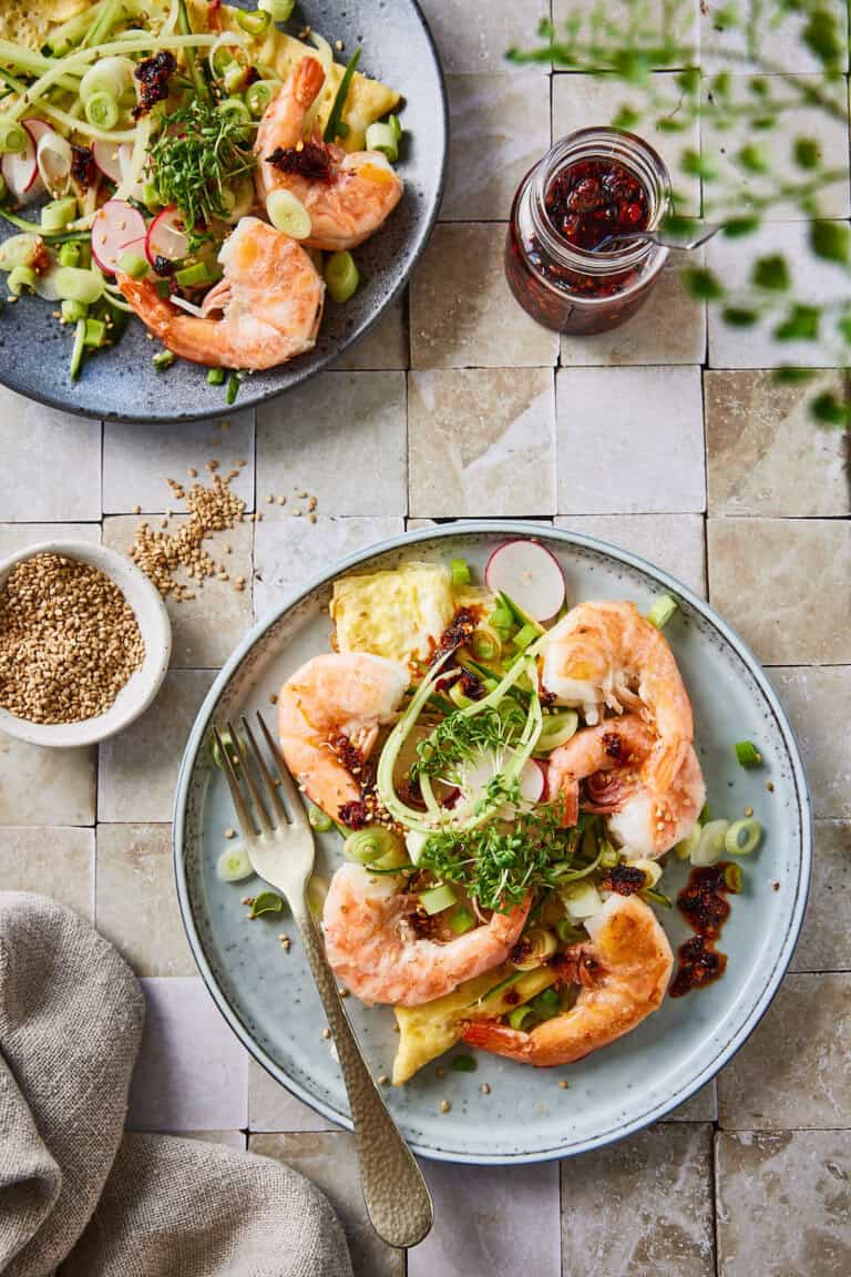 Een heerlijke snelle Aziatische omelet met garnalen en een pittige chilijam. Dit snelle gerecht zet je in no time op tafel en is perfect als lunch.
