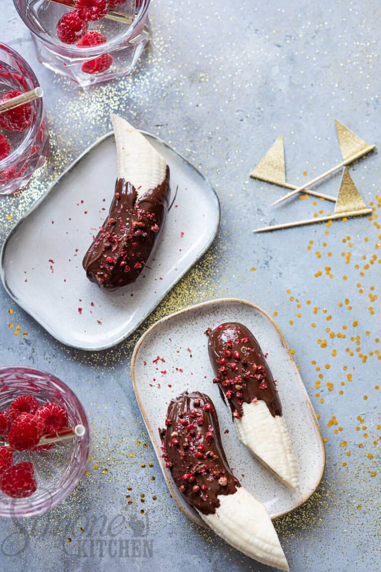 - Doop de bananen in de chocola, laat even uitlekken en leg ze dan op een bordje. Besprenkel met de roze peper en serveer.