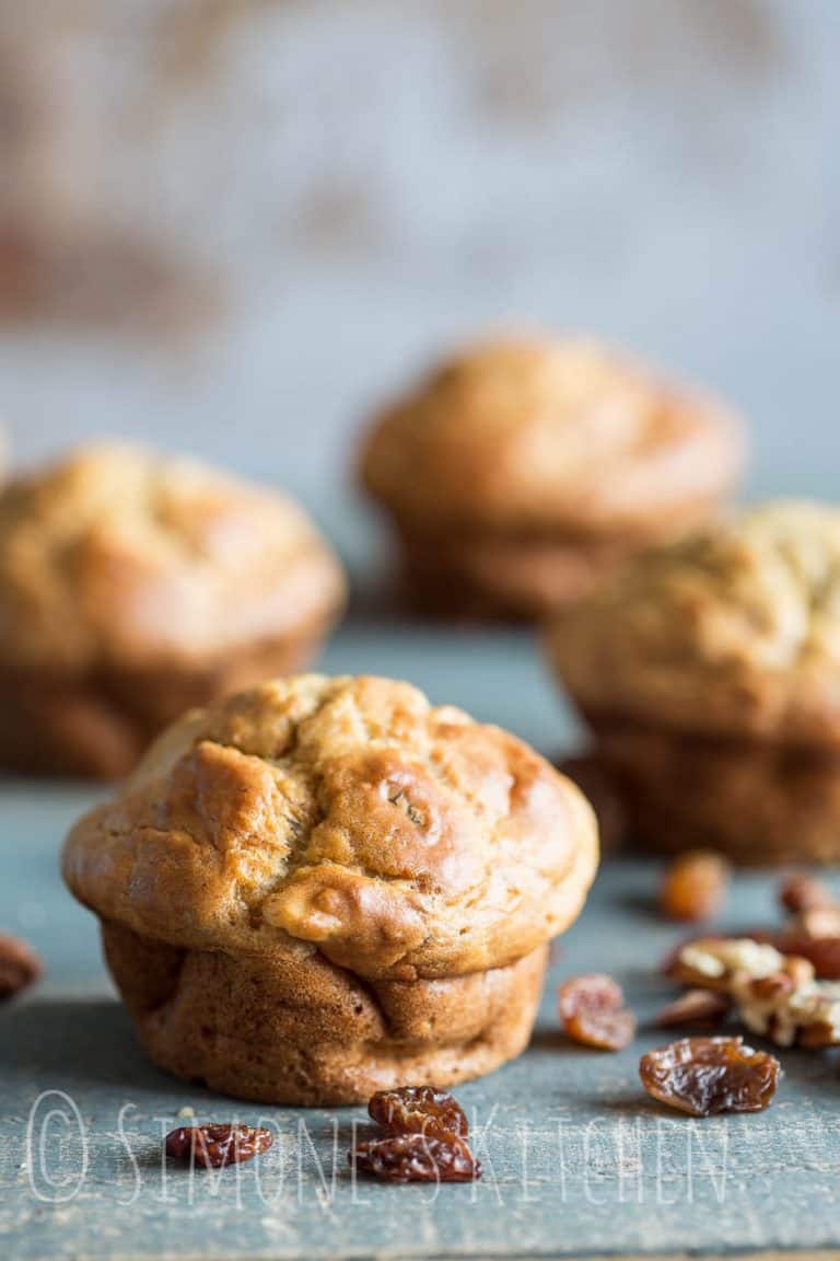 - Doe de twee bij elkaar. Meng de rozijnen en de noten erdoor en schep het in een muffin blik. Ik heb ze zo in het blik gedaan, zonder van die papiertjes. Die kun je natuurlijk gebruiken als je dat wilt of je kunt het blik goed invetten. Gebruik wel een anti aanbak blik.