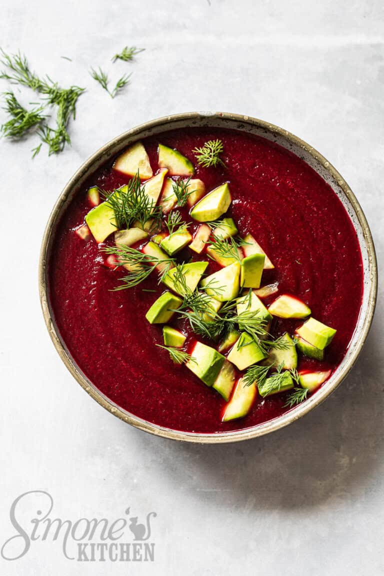 Hou je van biet dan is deze bietengazpacho iets voor jou! Het is lekker fris, vult goed en is super eenvoudig om te maken. Lekker met wat blokjes avocado en verse dille.