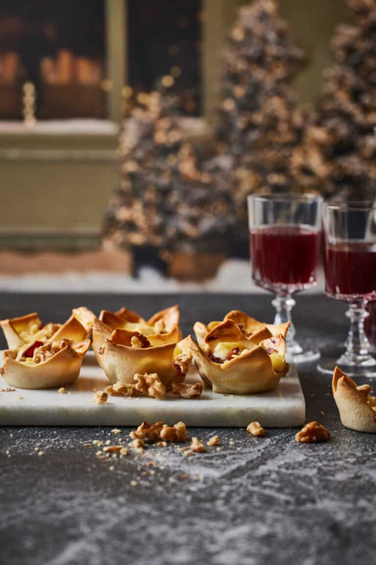 - Leg de plakjes bladerdeeg in de gaatje en vul ze met de blokjes brie en een theelepel van de cranberry compote. Verdeel de spekjes erover (optioneel)