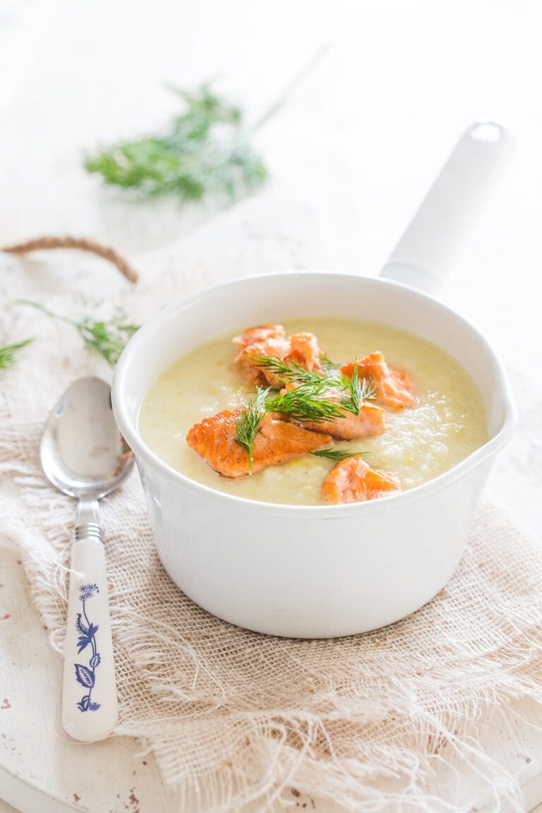 Hou je van bloemkool en hou je van knolselderij? Dan is deze bloemkool knolselderijsoep voor jou! Ik serveer de bloemkoolsoep vervolgens met gebakken zalm in vlokken op de gepureerde soep. Heerlijk!