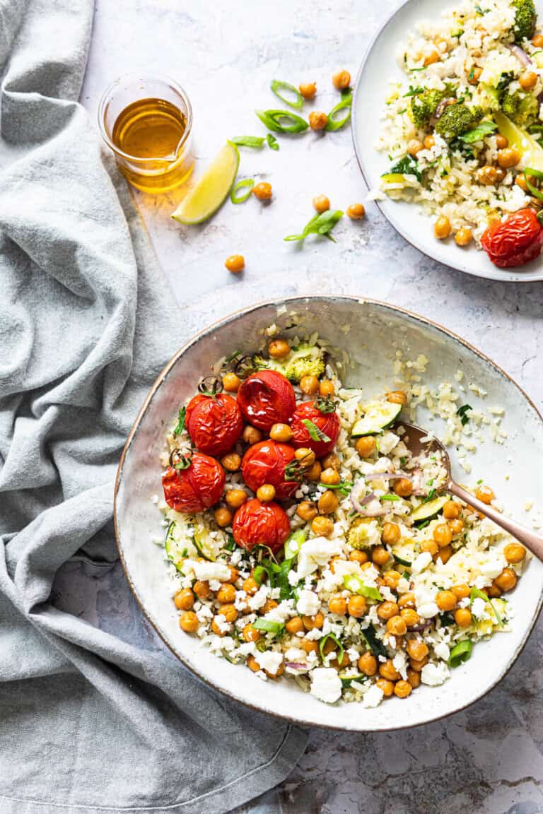 Kun je écht niet zonder gewone rijst? Dan kun je ze ook prima combineren. Meng bijvoorbeeld 50% rijst met 50% bloemkoolrijst. Zo krijg je het beste van beide werelden. Hieronder vind je in ieder geval een selectie van mijn favoriete recepten met bloemkoolrijst – van pokébowls tot risotto en meer.