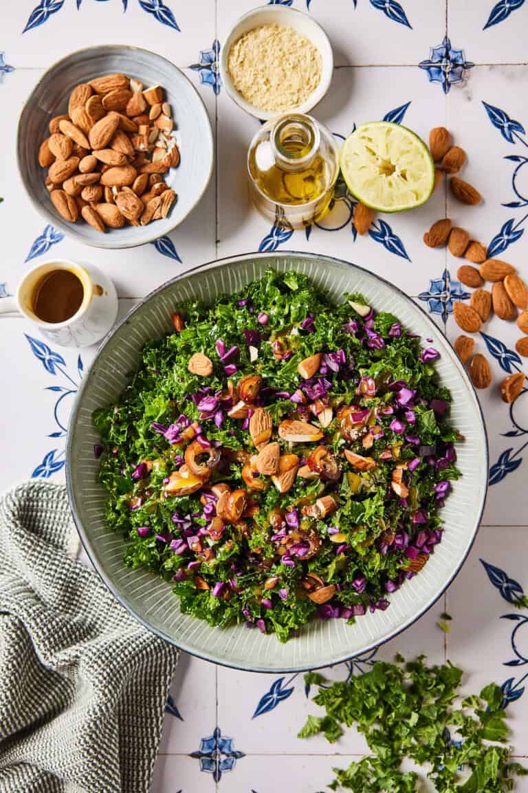 Boerenkoolsalade met rode kool, dadels en geroosterde amandelen. Heerlijk als stevige maaltijdsalade en perfect voor koude winterse dagen.