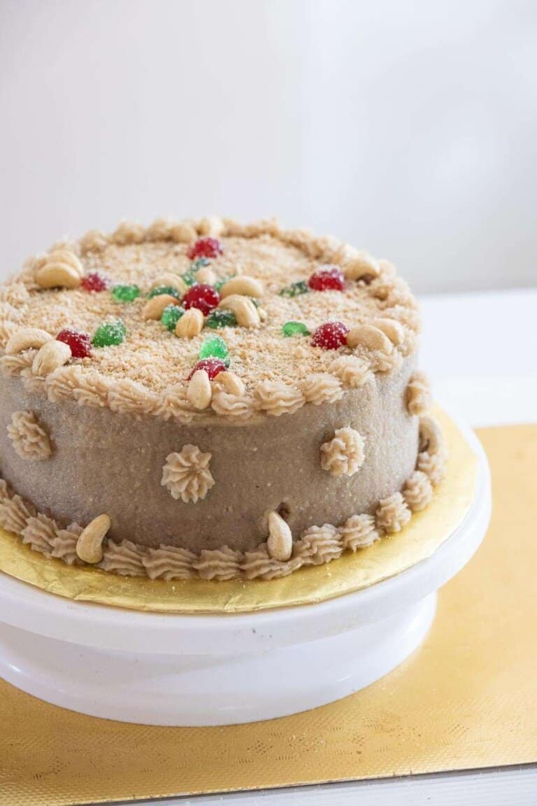 Vervolgens ga je de bolo di kashupete helemaal rondom afsmeren met de cashewcreme. Je kunt het zo garneren als je zelf wilt maar traditioneel is het zoals je hier op de foto’s ziet van het eindresultaat. Handig om de cashewcreme warm op de taart te smeren. Zodra het afkoelt gaat het uitharden en wordt het minder makkelijk om te verwerken.