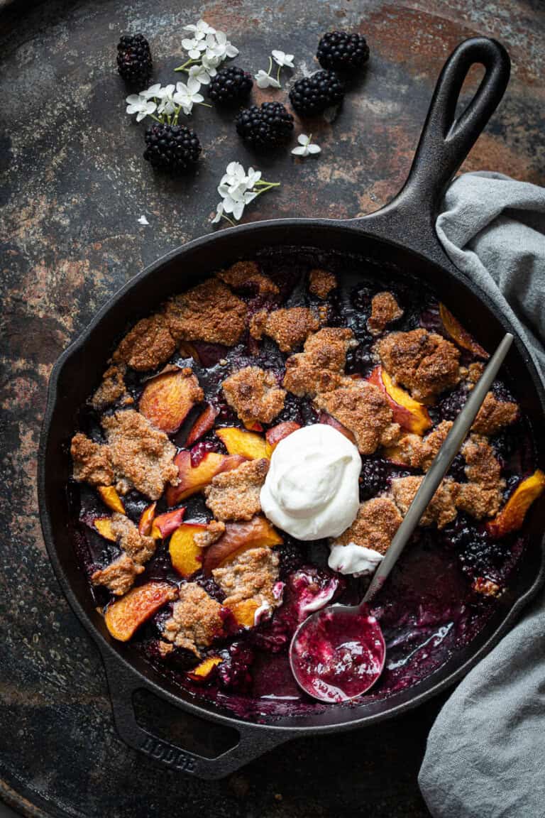 In combineerde de bramencobbler in dit geval met nectarine’s. Dat is natuurlijk optioneel. Je kunt er ook voor kiezen om alleen bramen te gebruiken of je kunt de nectarines vervangen voor perziken of een ander fruit naar keuze.