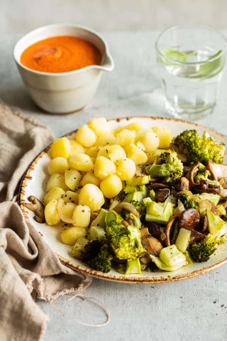 Voor dit recept rooster ik de broccoli in de oven. Ik hou van de extra smaak die daardoor aan het gerecht wordt gegeven, maar heb je geen tijd om de broccoli te roosteren dan kun je het ook gewoon even kort koken en daarna meebakken met de ui en de champignons. Ook dat is mogelijk.