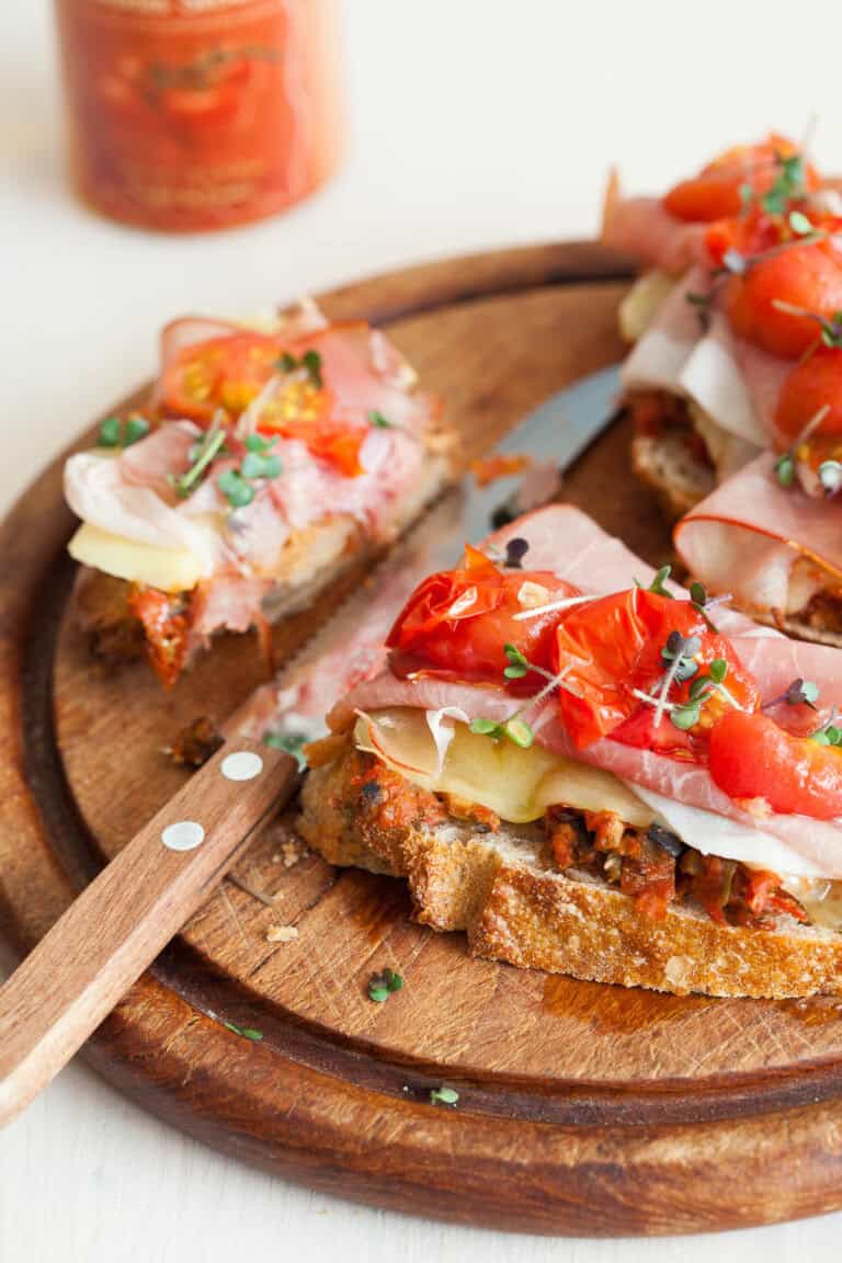 Voor de versie die je hier op de foto’s ziet gebruikte ik een tapenade die ik kant en klaar heb gekocht. Daarop kwam een lekker pittige kaas. Die heb ik gesmolten in de oven. Dat heeft maar heel kort nodig. Daarop een goede rauwe ham en dan getopt met geroosterde tomaatjes en – optioneel – wat cress.