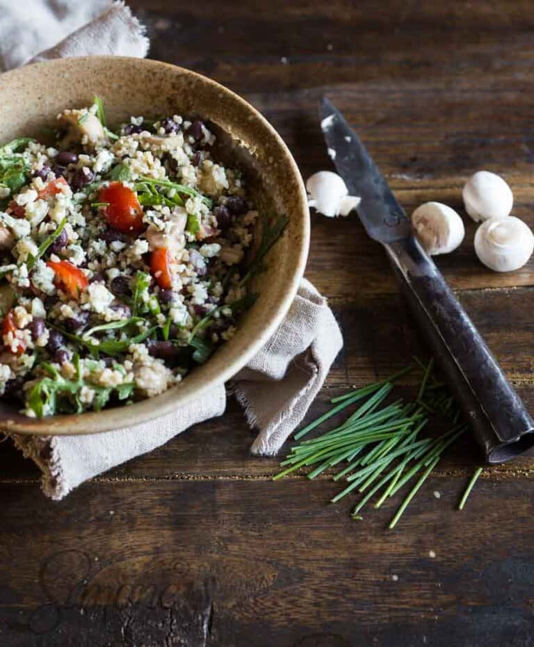 - Doe de champignons, de kerstomaatjes, bieslook, rucola en de uitgelekte adukiboontjes bij de bulgur in de kom en mix het goed door.
