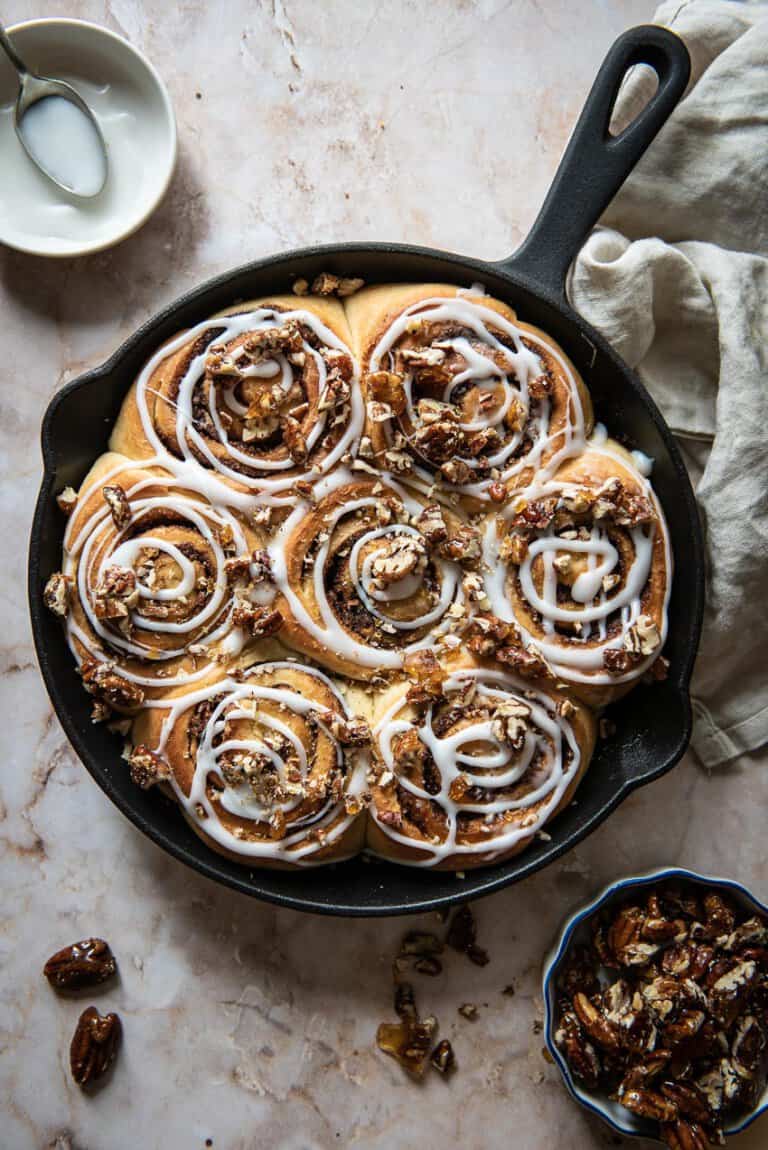 We bakten dit keer de buns in mijn favoriete lodge pan. Je ziet dat een gietijzeren pan echt van alle markten thuis is en ja, ook dit soort baksel kun je er prima in maken. Overigens past niet al het deeg in de pan, dus wil je ook je lodge (of andere) gietijzeren pan gebruiken hou er dan rekening mee dat je nog deeg over hebt om een andere ovenschaal mee te vullen. Er gaan ongeveer 15 stuks uit het onderstaande recept.