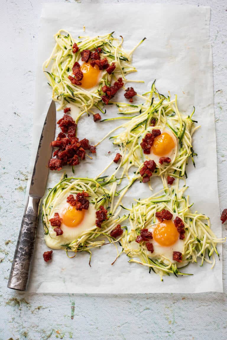 - Verdeel de courgettespaghetti in vier gelijke porties en draai er nestjes van. Leg ze op de bakplaat en maak een holte in het midden van het nestje. Breek in elke holte een ei.