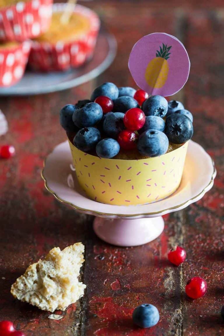 Dus ik bedekte de cupcake met vers fruit in plaats van boter. Enne… ja dat is heel lekker maar je hebt er wel een vork bij nodig om het te eten… 🙂 Anders rollen alle besjes er net zo hard weer vanaf. Ik versierde de cupcakes voor deze feestelijke gelegenheid met (gratis) printables van Radbag. Die vind je onder aan de blogpost van radbag (link hierboven!) En ik moet nog een beetje recht leren knippen zie ik nu. Hahaha… Dus dit is eigenlijk een hele gezonde cupcake. Er zit honing in, dat dan weer wel en ik gebruikte honing met gember. Superlekker!