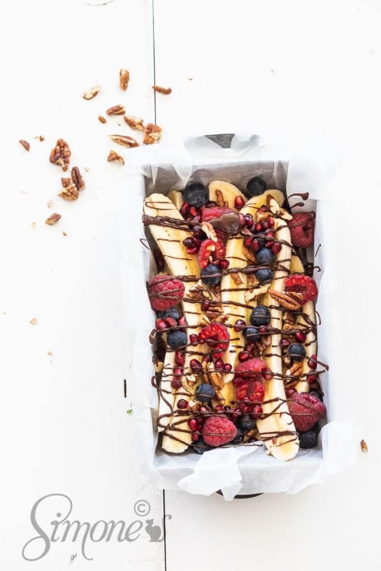 Deze versie van de bananasplit is zonder ijs. Beetje gek eigenlijk nu ik erover nadenk, maar stel dat je niet zonder ijs kunt dan kan ik aanraden om ijs van bevroren bananen te maken voor erbij. (Dat is heel simpel. Je bevriest bananen of ander fruit en doet dat vervolgens door de blender. Klaar!) Ik bedenk me dat nu pas, terwijl ik dit zit te tikken dus dat schiet lekker op he. Wil je dat ijs maken zorg dan dat je de banaan in plakjes invriest en niet in zijn geheel. Dat kunnen de meeste blenders echt niet aan. Laat het een heel klein beetje zacht worden voor je het draait.