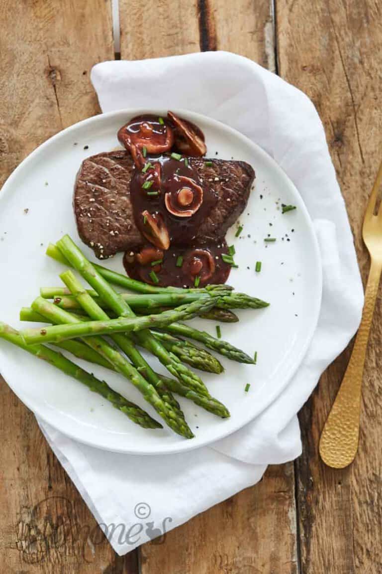 Het vlees van een hertenbiefstuk is over het algemeen vrij mager. Pas dus op dat je het niet te lang doorbakt. Toch jammer als je een ultieme portsaus maakt en je hebt daarbij een doorbakken hertenbiefstuk.