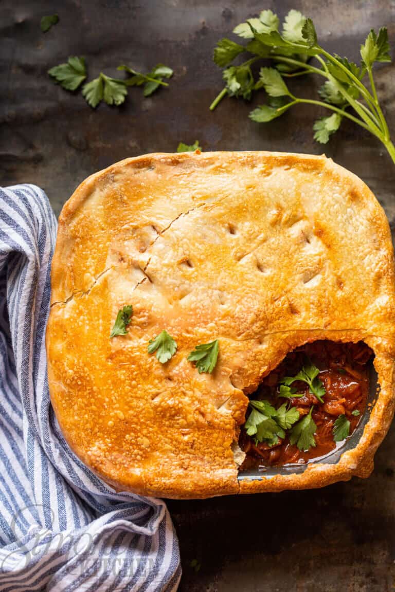 - Schep de heerlijke vulling in een mooie ovenschaal en dek de vulling toe met het hartige taartdeeg. Bestrijk het deeg lichtjes met wat geklopt eigeel en prik er een paar gaatjes in aan de bovenkant zodat de lucht kan ontsnappen. Zet de schaal voor ongeveer twintig minuten in de oven. Haal de pie eruit wanneer het deeg een mooie goudbruine korst heeft gekregen. Serveer eventueel met een mooie, romige aardappelpuree en een goed glas bier.