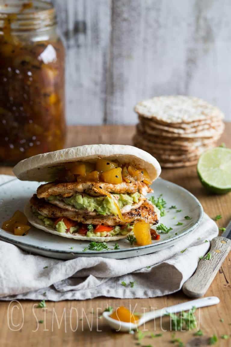 - Het is al tijd om de burger op te bouwen: snij de pita doormidden en smeer op de onderste helft een dikke laag avocadocrème. Drapeer hierop een handje van de paprikareepjes en leg, hier een halve kipfilet op. Leg op de kipfilet een matze en besmeer deze ook weer met een dikke laag avocado. Op de matze met avocado leg je de tweede helft kipfilet, nog een matze en tenslotte leg je de bovenste helft van het pitabroodje erop.