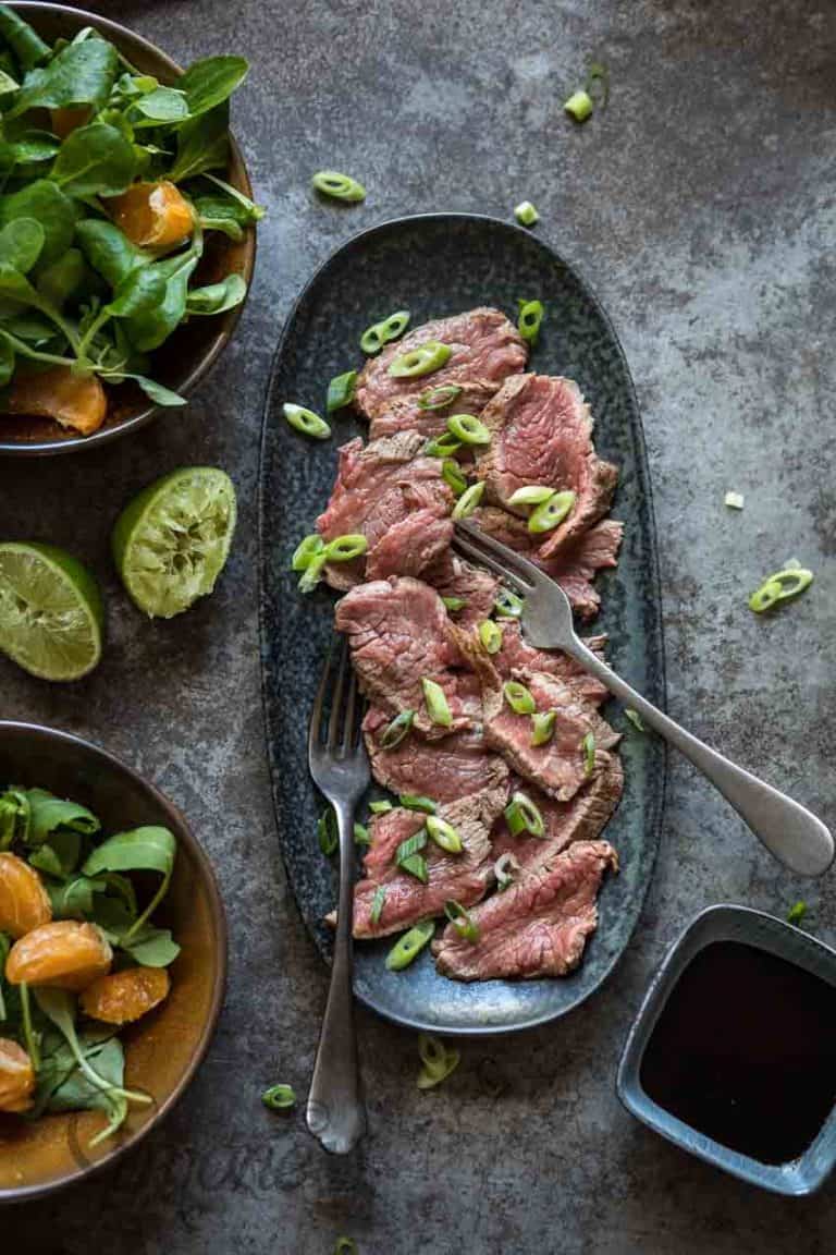 En omdat wij dudes, toch regelmatig niet zo op de calorietjes letten wanneer we de keuken inrennen voor wat lekkers, bewijzen we hier dat je met mooie ingrediënten snel een lekker, gezond en toch stoer gerecht op tafel kunt toveren. Hier het recept voor die salade waar je ook indruk mee maakt op je stoerste vrienden. De salade met tataki van diamanthaas. Tataki is een bereidingswijze van vlees of vis die je gloeiendheet dichtschroeit en daarna met zuur (citroen of azijn) besprenkelt om het vlees extra mals te maken.