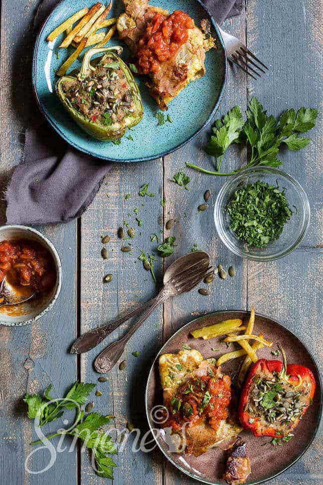 - Wanneer de groentemix niet meer zo vochtig is, maar nog wel smeuïg, de gehalveerde paprikaschaaltjes hiermee vullen. Strooi over ieder paprikaschaaltje wat gehakte pijnboompitjes en zet ze dan in de oven tot de paprika gaar is. Na een kwartier in de oven de schaaltje om de vijf minuten even controleren op gaarheid. Strooi wat gehakte koriander over de groenteschaaltjes direct wanneer ze uit de oven komen.