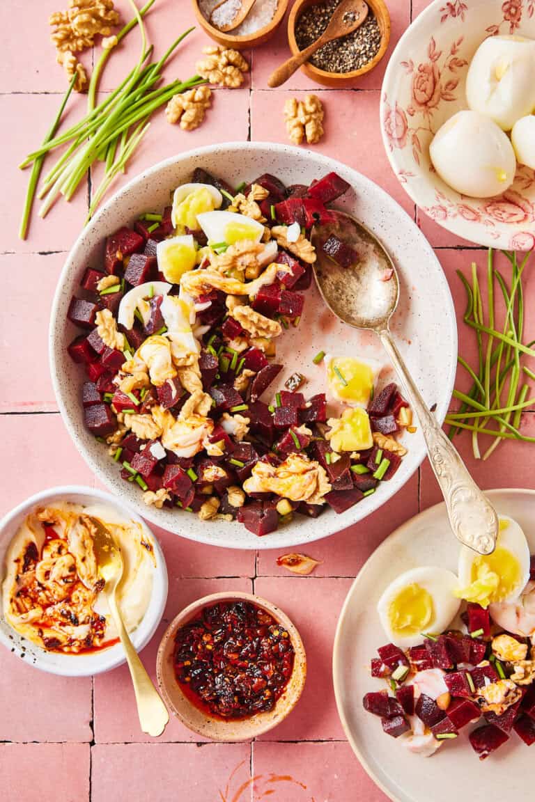 En natuurlijk is de kleur gewoon een bonus. Ik word altijd wel vrolijk van salades die een dergelijke kleur hebben. Wil je dat niet of hou je eenvoudig niet van bietjes? Check dan zeker ook eens mijn eiersalade. Die is ook heel eenvoudig maar natuurlijk zonder de bietjes.