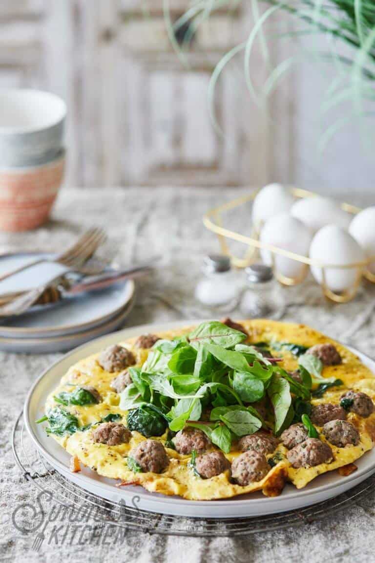Deze gehaktbal frittata is heerlijk voor een wat luiere zondagochtend of voor de lunch misschien ook wel. Of misschien juist wel. Het vult goed door het ei en door de gehaktballetjes en is gewoon erg lekker. Ik eet het graag met een flinke klodder mayonaise (want ja, alles is lekkerder met mayonaise toch?)