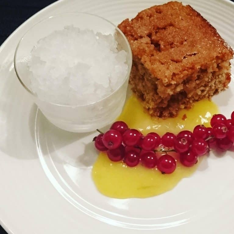 De cake is dankzij de gin-tonicsiroop zo zacht, dat het bijna een pudding lijkt. Hij is heerlijk als taart bij de koffie of thee, maar in combinatie met de curd en granita weet je helemaal niet wat je proeft. Maak de lemon curd vooral zelf, dat is vele malen lekkerder. Het kost even tijd, maar is wel een mindfull klusje. De granita – tot slot – maakt dit dessert lekker verfrissend en is ook zeer geschikt als ‘palate cleanser’. Het neutraliseert je smaakpapillen.