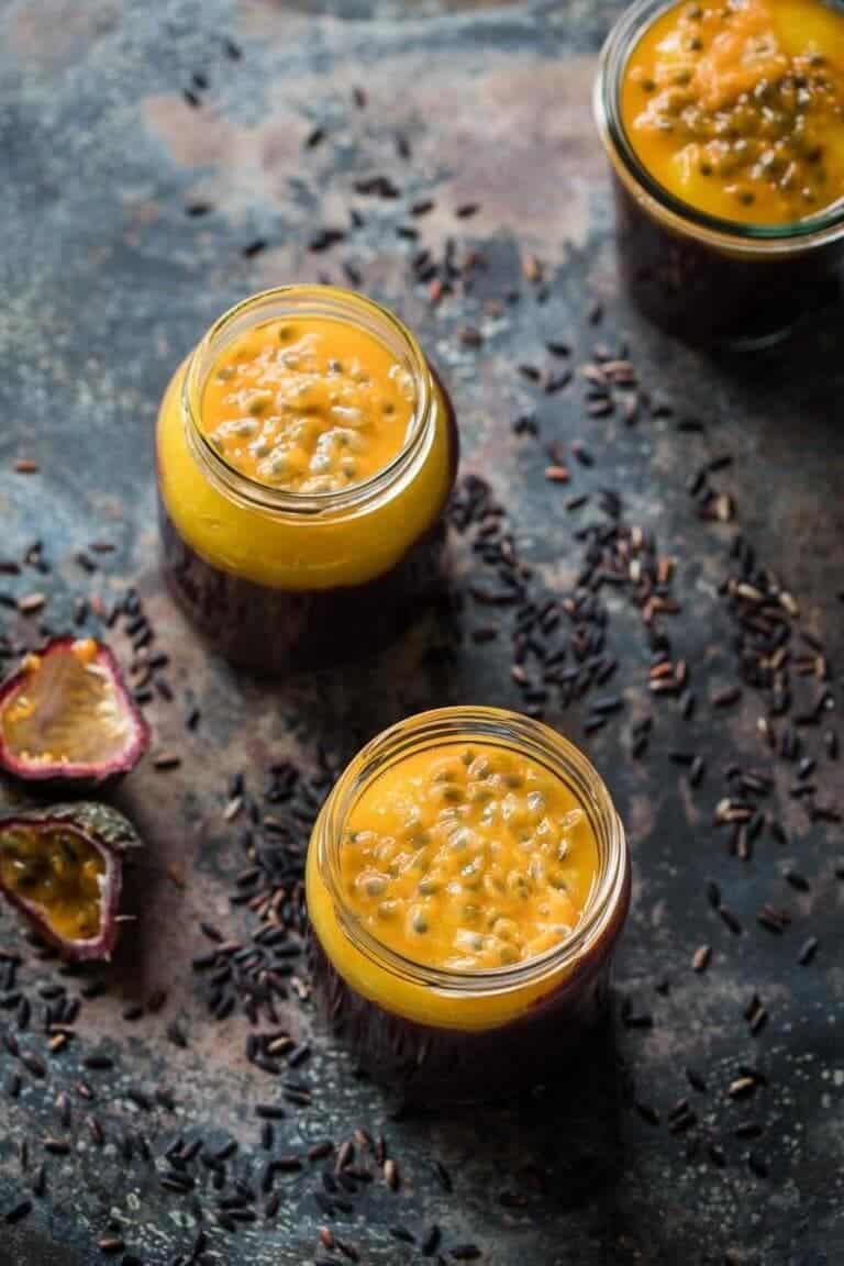 - Doe het rijstmengsel in 4 glazen en schep hier de mango en het passiefruit overheen.