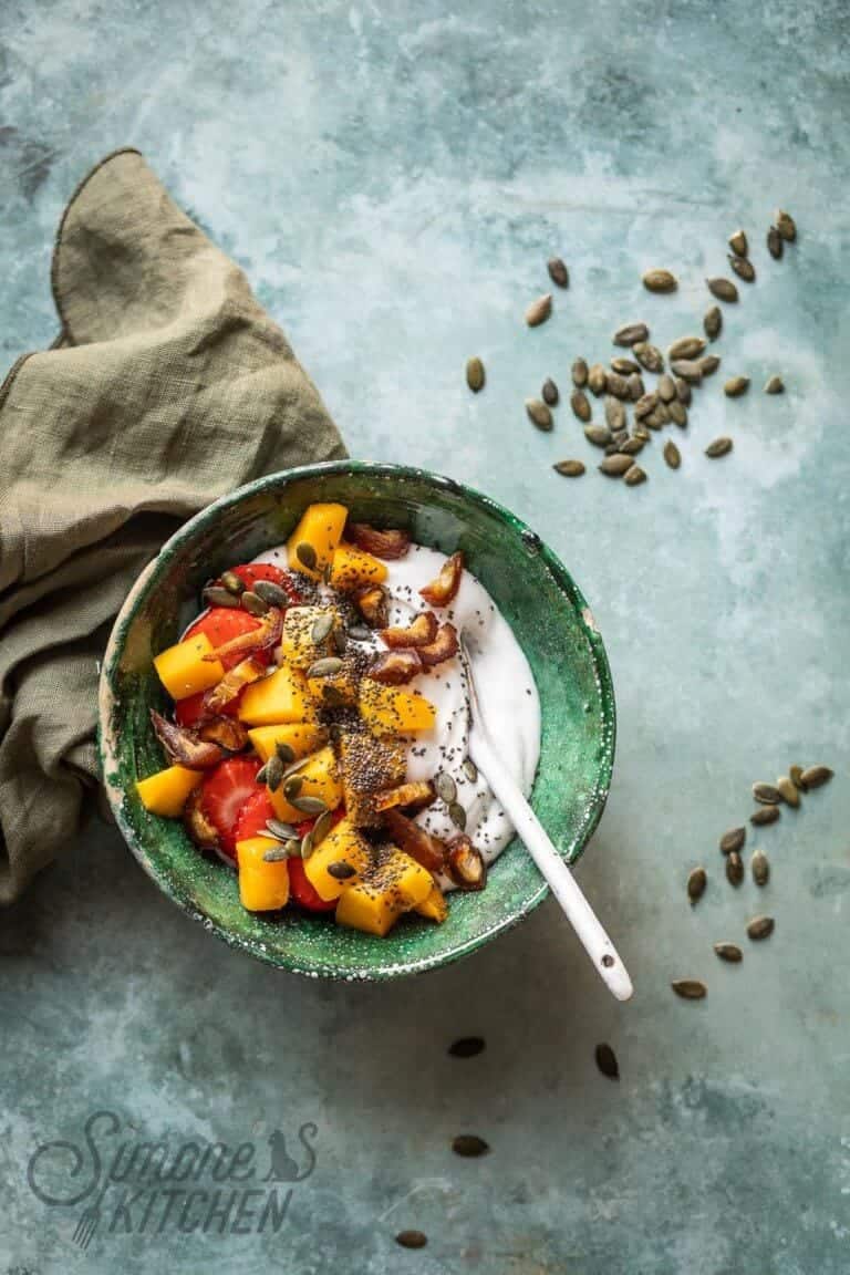 Kokosyoghurt bowl met fruit, pitten en dadels