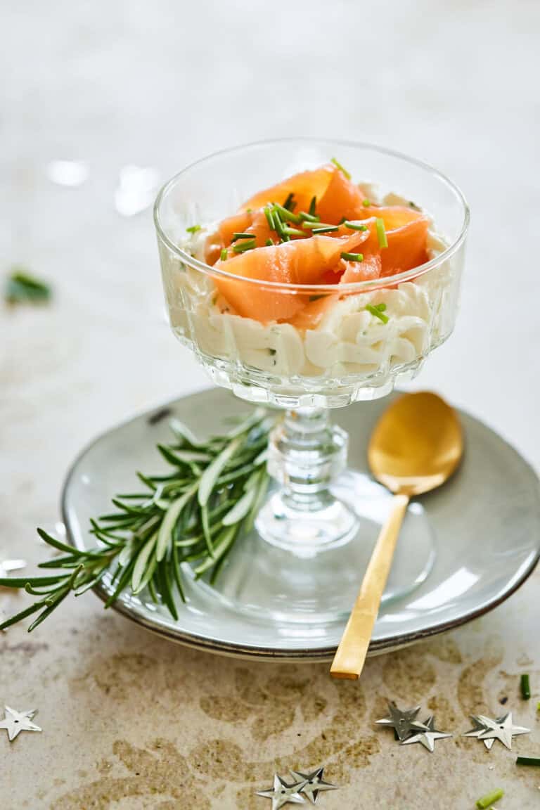 Kleine glaasjes gevuld met kruidenkaas en afgemaakt met gerookte zalm. Het is een feestelijk voorgerecht met gerookte zalm, geschikt voor de kerstmaaltijd maar natuurlijk ook voor de paasdagen (of willekeurig welke andere feestdag)