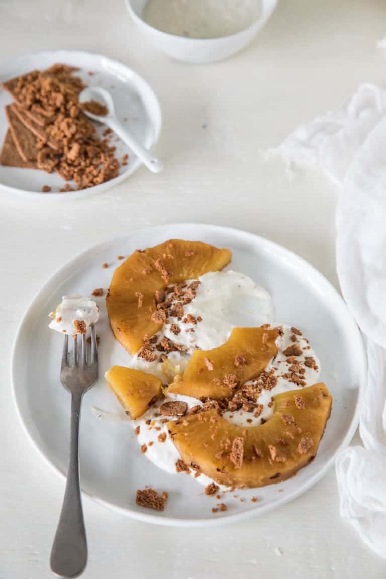 - Snij de ananas door midden en laat even afkoelen. Maak vier bordjes klaar met wat van het roomkaasmengsel en leg hier de schijven ananas op. Bestrooi met de gemberkoekjes.