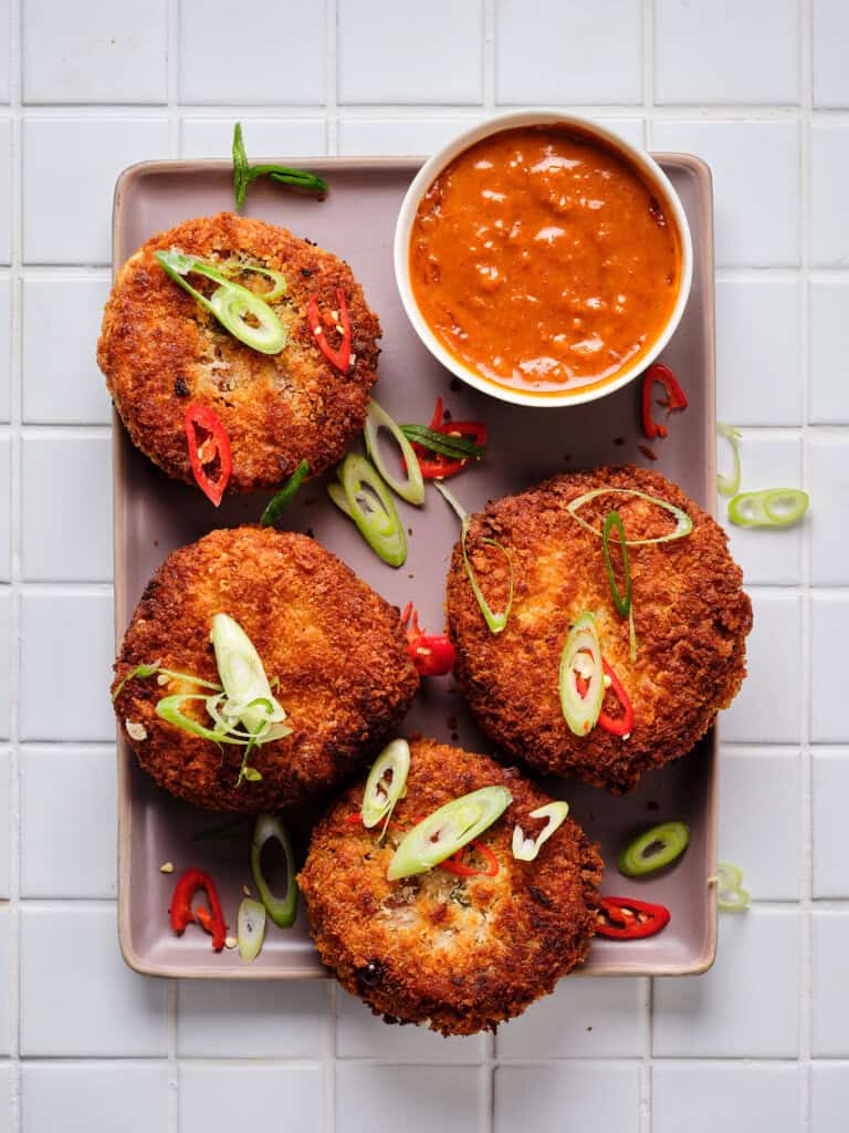 - panko – voor de lekkerste coating ever! Panko is Japans broodkruim en wat grover dan gewoon paneermeel. Omdat je het twee keer door de panko rolt heb je daar vrij veel van nodig. Ongeveer 200 gram maar hou wat extra achter de hand voor het geval dat.