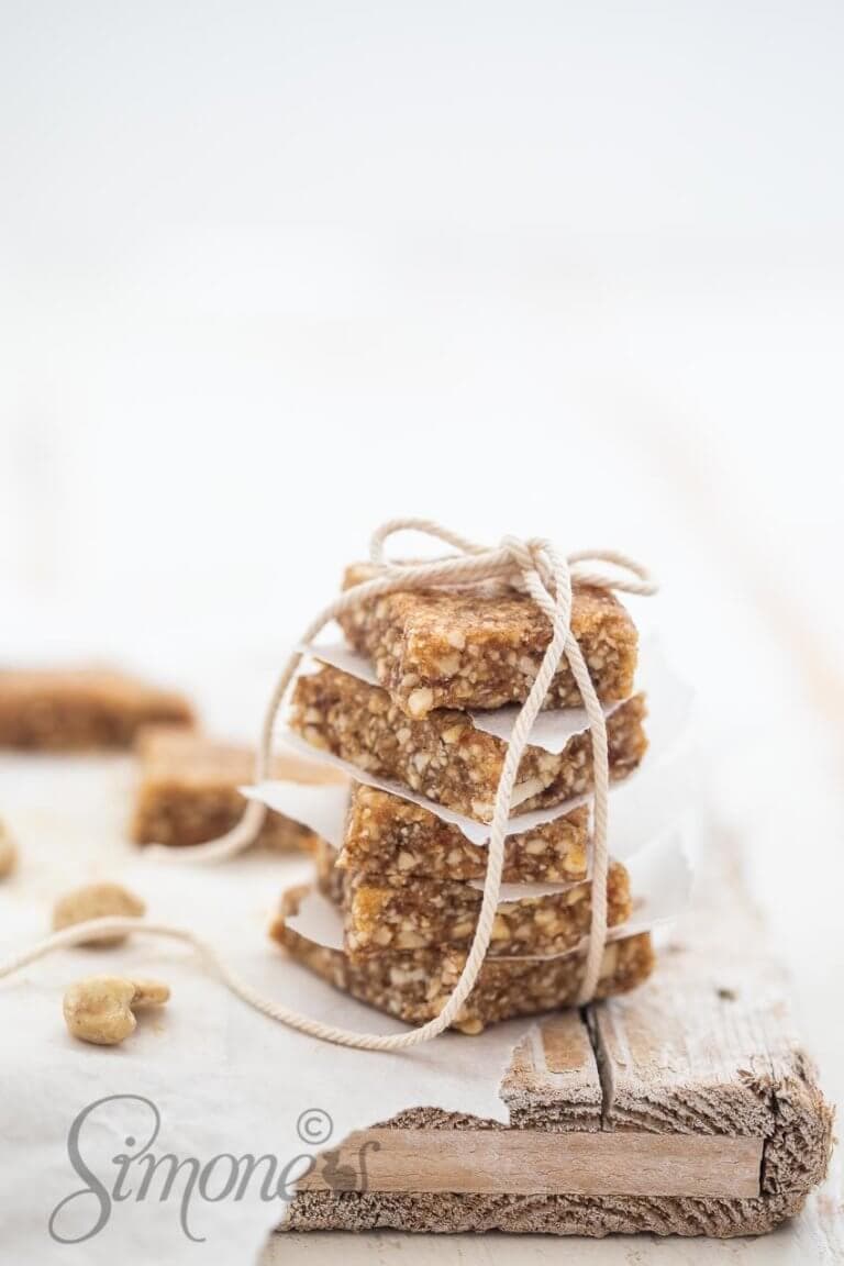 Het recept is zo eenvoudig dat je het amper een recept kunt noemen. Je neemt cashewnoten en je neemt dadels. Van beiden de helft. Mengt dit goed in een keukenmachine, plet het in een bakje en voila. Je hebt reepjes. Tot zover ging alles goed. Ik zette de reepjes in een bakblik in de koeling en ging door met andere zaken tot het tijd werd om ze op de foto te zetten. Om te beginnen de smaak; die is top. Wel erg zoet dus als je last hebt van schommelende bloedsuikerspiegels maak dan niet de fout om te denken dat dadels geen suiker zijn. Caroline en ik hadden best wat van de reepjes gesnoept met als gevolg dat we allebei een uur later een mega suikerdip hadden. Pfft… Niet teveel van eten dus. Maar 1 reepje kan prima.. 😉