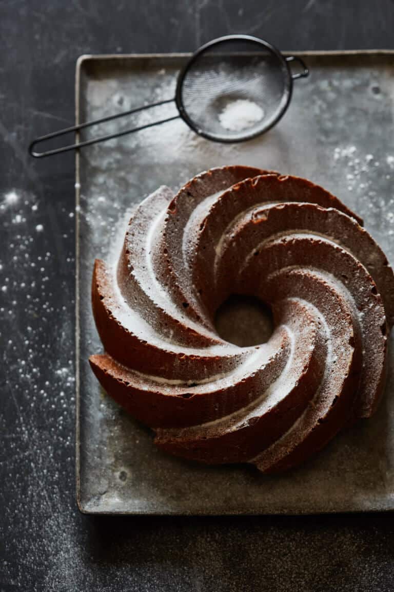 Voor het maken van deze tulband gebruikte ik een van mijn favoriete vormen van Nordic Ware. Essentieel bij het bakken met deze vormen is het goed invetten en bestuiven. Dat is natuurlijk bij elke vorm belangrijk maar door de vele richels in deze vorm extra belangrijk.