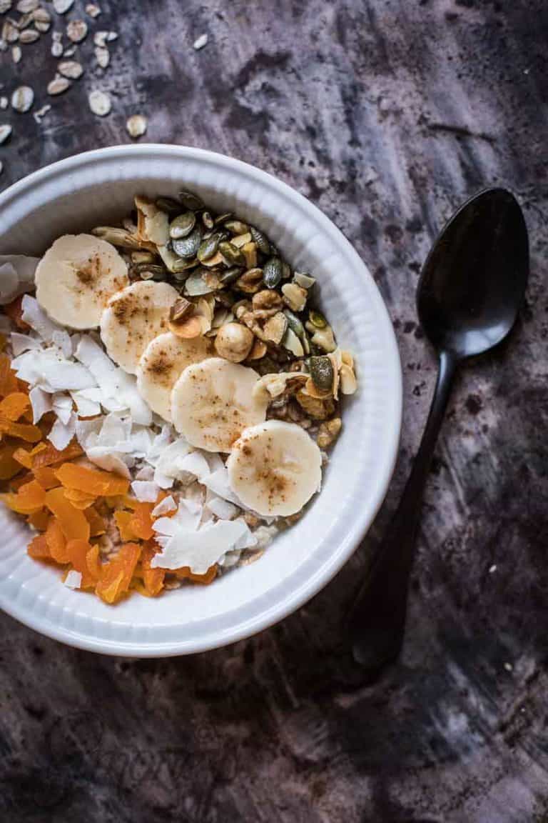 - Haal ’s morgens uit de koelkast en beleg met de gedroogde abrikozen, de kokossnippers, gemengde noten en de banaan. Strooi een klein beetje kaneel over de banaan en eet meteen.