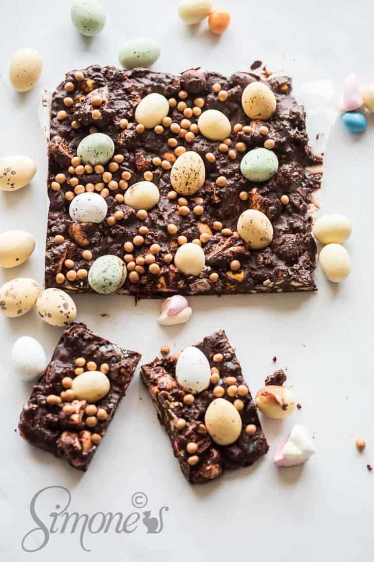 Deze overheerlijke rocky road zit vol met paaseitjes maar kun je maken met elke willekeurige chocola naar keus.