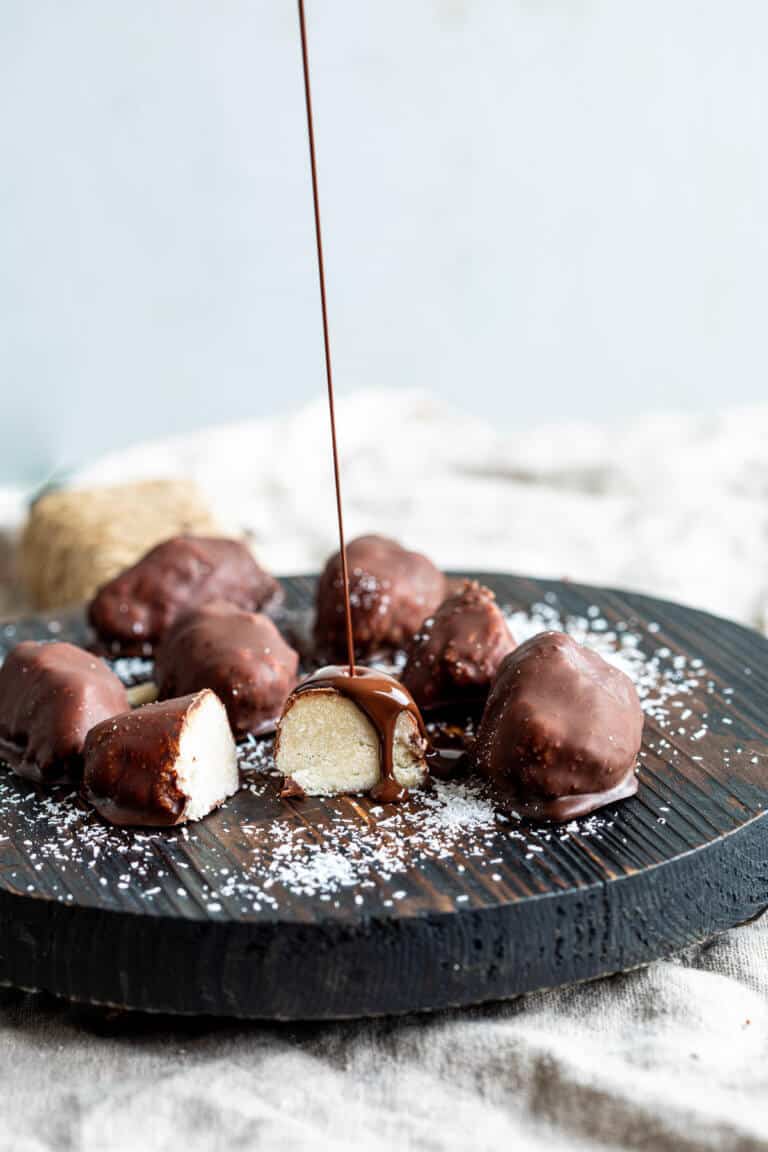 Het maken van de kokosrepen is super eenvoudig. Je mixt gewoon alle ingredienten bij elkaar. Kneed ze even goed door en daar maak je dan een soort reepjes van. Die leg je in de vriezer terwijl je aan je chocodip werkt.