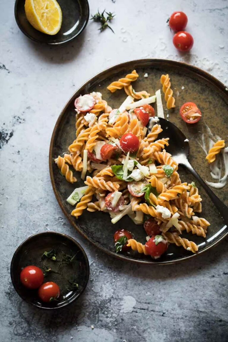Dit lekkere en makkelijke gerecht noem ik ook wel een Italiaans koolrabi recept. Simpelweg omdat deze pastasalade met koolrabi Italiaanse vibes heeft. Het is heerlijk als je van pastasalade houdt en lekker met de romige geitenkaas.