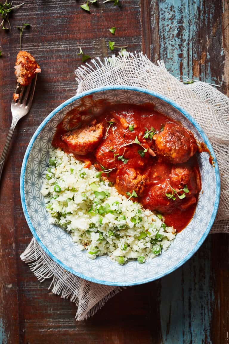 De pittige gehaktballetjes kun je trouwens ook goed eten als borrelsnackje. Niks mis mee. Maar ik eet het over het algemeen als onderdeel van de maaltijd. In dat geval meestal met bloemkoolrijst. Hoewel ook heerlijk met gewone rijst vind ik de extra groente bij de bloemkoolrijst altijd wel een plus. Dus dat is wat er meestal bij komt.