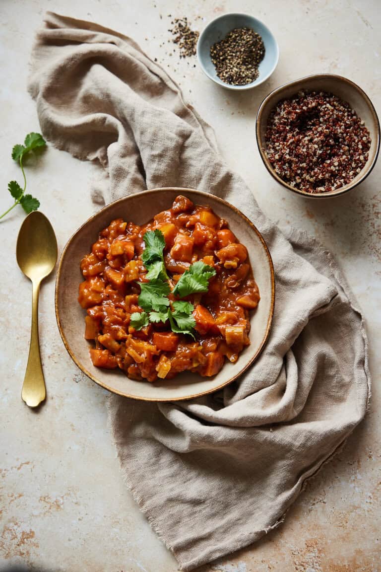 Soms voeg ik ook wat kokosmelk toe aan de pompoenstoofpot. Je kunt het vervolgens serveren met de quinoa of je kunt er aardappelpuree bij serveren.