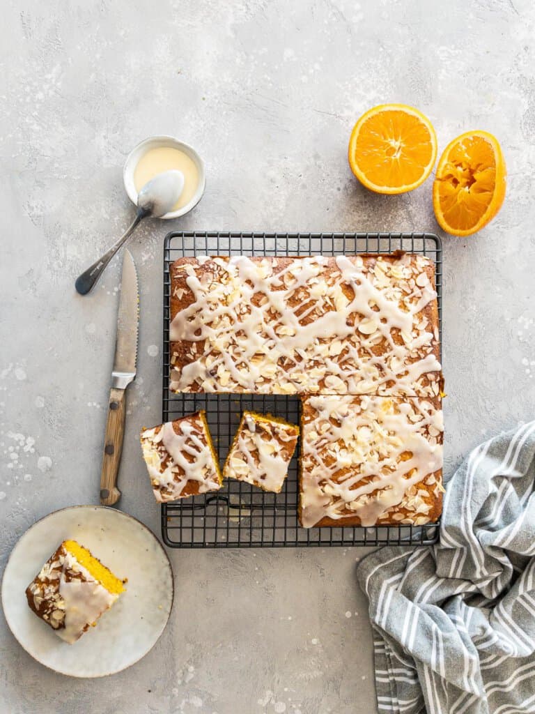- Maak de icing door het poedersuiker te mengen met het sinaasappelsap tot je een goede dikte hebt. Sprenkel de icing over de cake en serveer.