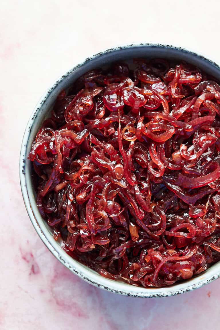 Dit is een rode uien chutney maar je kunt dit natuurlijk ook prima maken met gewone gele uien. In dat geval gebruik je geen rode wijn azijn maar witte wijn azijn. Beide kan, maar de kleur wordt dan een beetje gek. Check ook even het uitgebreide artikel over uien karameliseren.