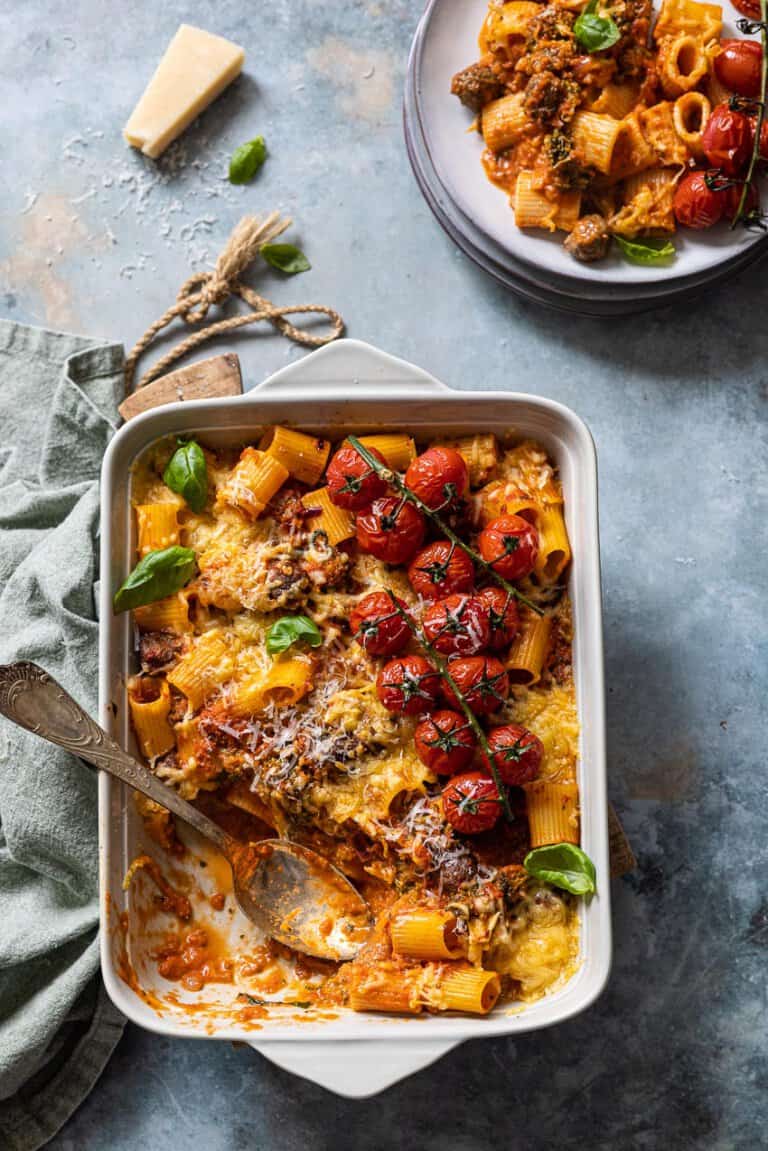 Met dat grauwe grijze weer van de laatste dagen had ik zin in wat lekkers en zonnigs. Nu weten jullie natuurlijk al dat ik fan ben van de producten van Mutti en in deze romige pasta ovenschotel zitten dan ook maar liefst drie verschillende tomatenproducten. Voor dat lekker zonnige gevoel! 😉