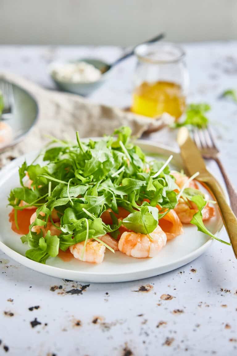 De rucola is lekker maar je kunt hier ook prima een andere soort sla gebruiken. Veldsla vind ik zelf altijd lekker of een mooie krulsla. Als je het wilt serveren als kerstvoorgerecht dan is het handig om de sla op het laatste moment te dressen en op de garnalen en zalm te leggen. Anders is de rucola al verlept voor je het serveert en dat is zonde.