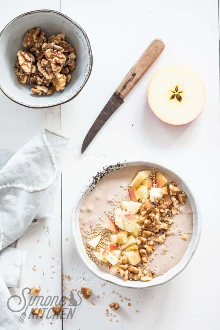 Ondanks het feit dat het dus eigenlijk nog steeds volop zomer is of hoort te zijn, heb ik wel deze overheerlijke smoothiebowl voor je. Met smaken die je lekker opwarmen. Voor mij zijn dat koekkruiden. Eigenlijk een verzamelnaam voor gember, kaneel, kardemom, nootmuskaat en kruidnagel. Dus heb je geen koekkruiden in huis dan kun je dat natuurlijk ook los toevoegen.