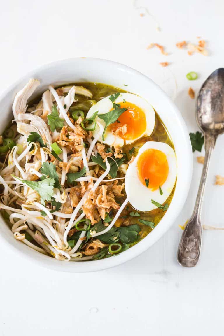 Soto is Indonesisch voor soep en bestaat in meerdere varianten maar dit is de meest gemaakte variatie. En nee, zal vast niet geheel traditioneel en typisch Indonesisch zijn, maar weet je; dat is prima. Deze soto ayam is superlekker en daar gaat het natuurlijk om! Er zijn ongeveer net zoveel verschillende versies van soto als er mensen zijn in Indonesië volgens mij maar de basis is natuurlijk kip en dat eitje kom je ook wel nagenoeg overal tegen.