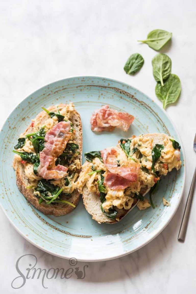 Scrambled eggs met spinazie op toast