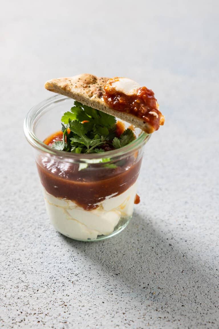 De held van de snacktafel is evenwel natuurlijk de tomatendip. Dit kun je heel lekker eten met wat toastjes of met – zoals wij deden – papadums en naanbrood. Zo lekker! Om het te maken is super eenvoudig. Tenminste als je eerst die tomatenjam of tomatenchutney hebt gemaakt. Ik denk trouwens dat het ook nog wel lekker is met een gewone jam uit de winkel.
