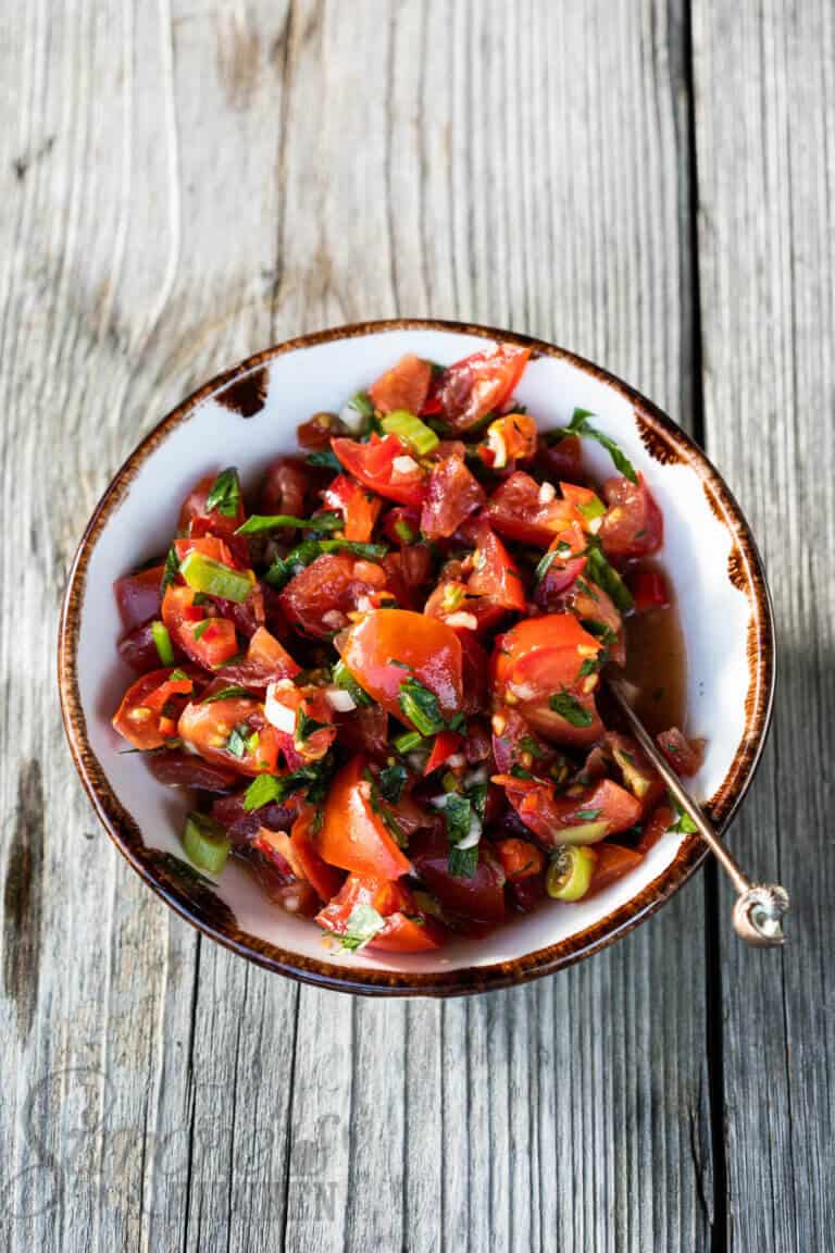 De tomatensalsa is heerlijk fris en zeker op warme dagen is het lekker om te eten bij de kipspiesjes of eet het eens op een stokbroodje. Ik serveer het graag bij de kip als tegenhanger. De kip is vrij pittig en dan is een lekker fris gerechtje voor erbij ideaal.