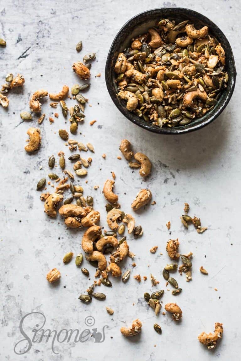 Ik vind het trouwens ook heerlijk in een bakje yoghurt of kwark ’s morgens. Handje van deze mix erbij, wat vers fruit en je hebt een prima ontbijtje. De mix is makkelijk te variëren met noten naar keus. Ik had een grote zak met rauwe cashewnoten liggen dus gebruikte die. Plus ik ben gek op cashewnoten. Ik heb ze veel liggen om zo nu en dan een portie cashewroom te maken. Maar in de trailmix kun je de cashewnoten vervangen of aanvullen met noten naar keuze.