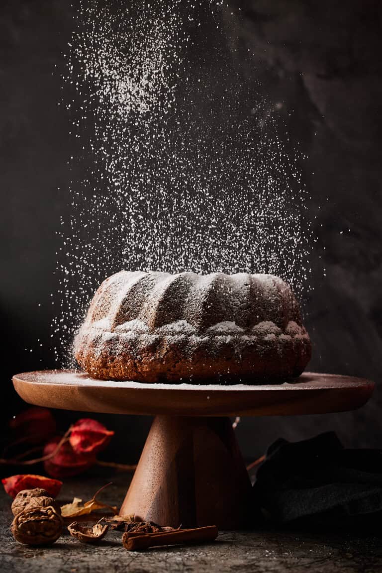 - Schep het beslag in een tulband vorm die goed is ingevet en bestoven met bloem. Bak de cake 40-50 minuten tot een mes er schoon uit komt.